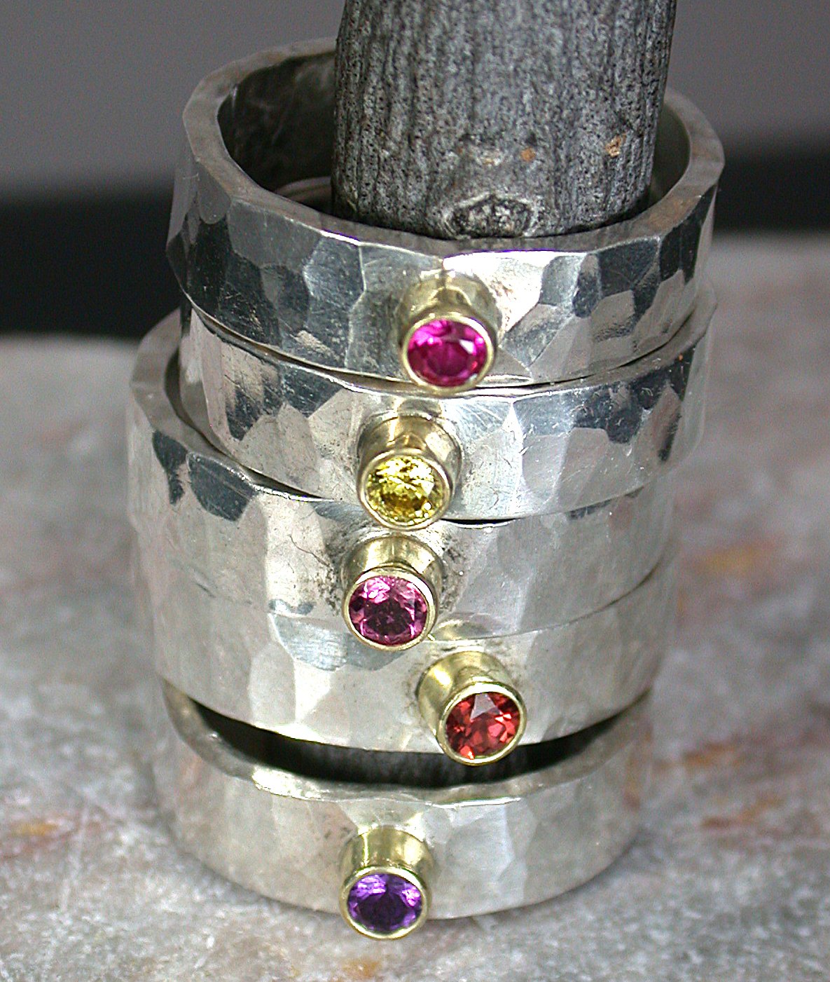 This eye-catching sterling silver band has a handsome hammered texture topped with a bright yellow 18-karat gold tube setting and a 3mm faceted stone. It is 1/4" wide and can be ordered with virtually any type of stone, in any size. Currently available (to receive before Christmas if ordered by December 20--add $5 is rush delivery is required): amethyst (purple); tourmaline (pink or green); sapphire (blue, yellow or red-orange). Others may be available-- please email your preferences to check availability. Can also be created in all gold-- contact for current price.